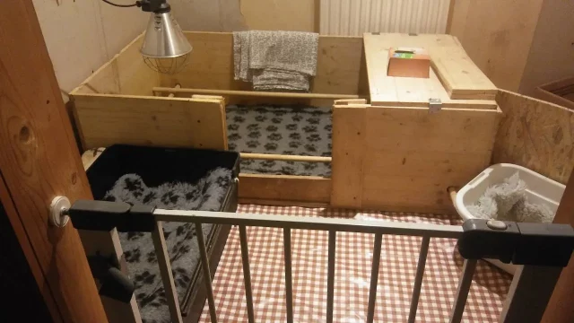 Mehrere Wochen vor dem errechneten Wurftermin gewöhne ich die Hündin an die Wurfbox. Sie ist bequem ausgestattet, großzügig in den Abmessungen und steht an einem gut temperierten Ort. Die Hündin soll dann sanft darauf hingewiesen werden, dass das ihre Wurfbox ist.